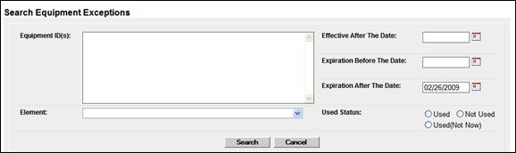 The Search Equipment Exceptions function can be used to determine if exceptions apply, did apply, or will apply to equipment. When the user selects Railinc Admin Functions>Exception Management>Search Equipment Exceptions, the Search Equipment Exceptions page is displayed (Exhibit 241).