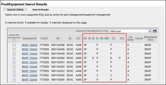 9. (Optional) Verify the Equipment Maintenance Code changes have been updated. If returned to the Pool/Equipment Search Results page, select the Search Criteria tab and reselect Search. The results page is redisplayed with changes made (Exhibit 144).